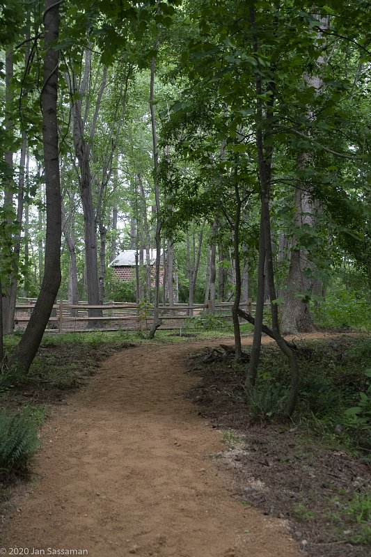 A focal point along the forest trails on the west side of the Galloway Ridge property is the reamians of an old tiler-brick constructed tobacco barn.