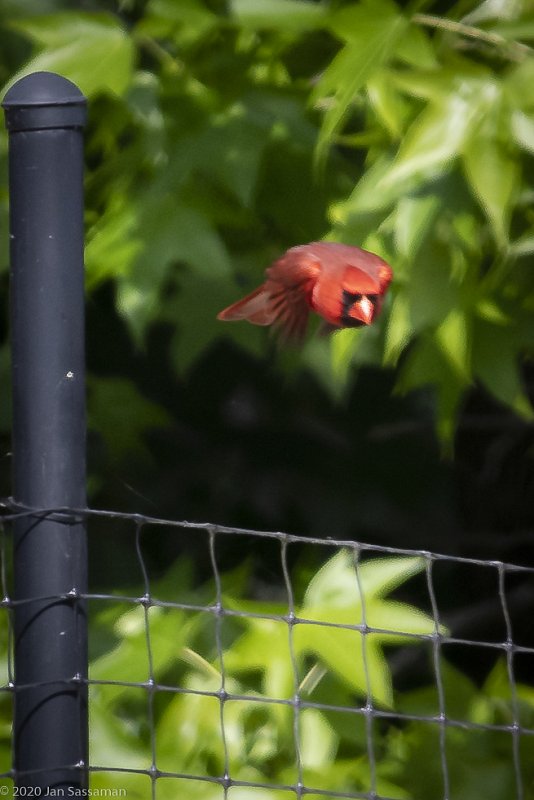 I managed to trip the shutter just before the Cardinal male launched himself in my general direction from the fence post on which he had been perched.