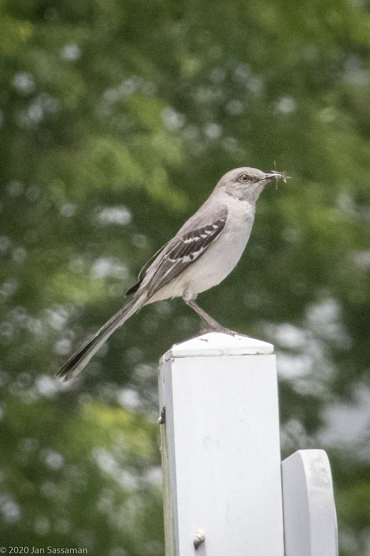 The Mockingbirds have been abundant, noisy, animals all through the spring at Galloway. y tend to perch on higher posts, lamp posts, etc. as they watch what is going on around them. This one has captured a fine insect meal.