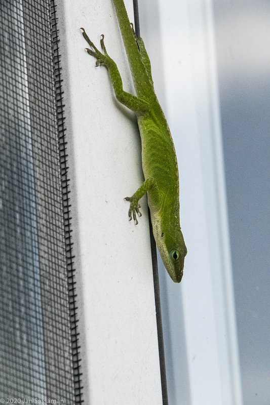 I can't resist a picture of this Anolis. Either a young male or more likely a female, somehow perched on the screen DOOR to our third floor "mini-balcony." They have developed the ability to climb smooth surfaces with toe pads that have a high degree of friction.