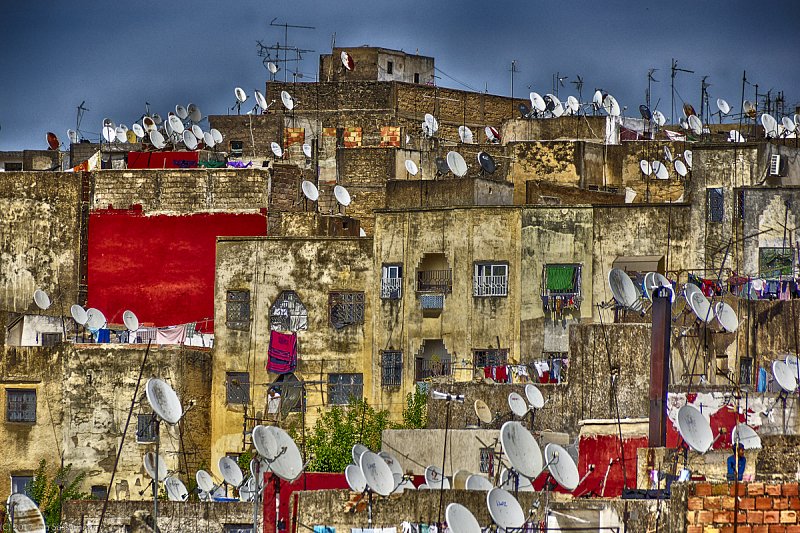 While photographing one of the tannery operations in Fes (Fez), I could not help noticing that many of the roof tops on the centuries-old buildings were festooned with direct TV satellite dishes, all pointing in the same direction. It was certainly a bit of a temporal juxtaposition to say the least.