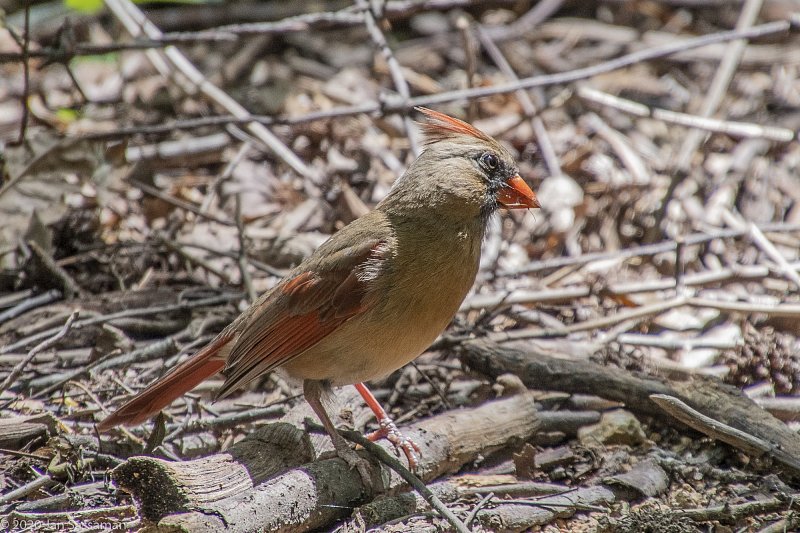 This female was seen near the bird feeder on the south boundary of the property, scrounging for food/.