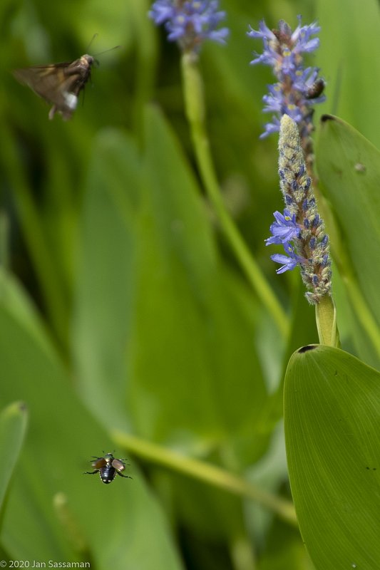 I snapped these two in the air among the Pickerel Weeds blossoms on the edge of the tion ponds, and only when I got beck and aw the photos on the computer saw the next photo.