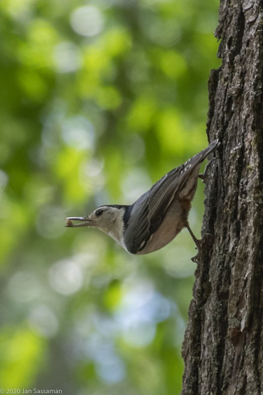 The are small but loud birds that actively forage for seeds, jumping about from limb to the side of the tree. The name "Nuthatch" comes from their behavior of jamming a large nut into tree back and then whacking the nut with their beak to release (hatch) the seed in the nut.