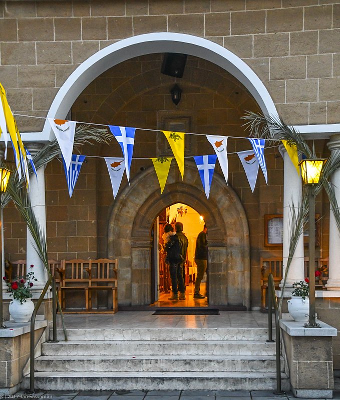 Again, banners representing the flags of Cyprus, Greece, and the Church, here at the entrance to a small church in the Nicosia suburb of Strovolos.