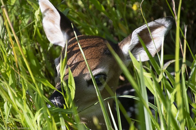 This little guy was hidden in the grass on a small portion of dry ground between two of the detention ponds. According to the NC Wildlife Resources Commission, there are some 1.25 million deer in North Carolina. White Tail Deer are widely distributed in the Americas, in North America east of the Rocky Mountains, and south into northern South America. Females give birth to one to three spotted fawns in mid- to late spring (May or June). For the first four weeks, the females hide the fawns in vegetation to keep scent levels low and avoid clues for predators. The mothers return to the fawns to nurse them four to five times a day. This strategy keeps scent levels low to avoid predators. High deer density, as in North Carolina, has increased the transmission of tick-borne diseases, such as Lyme disease which infects humans.