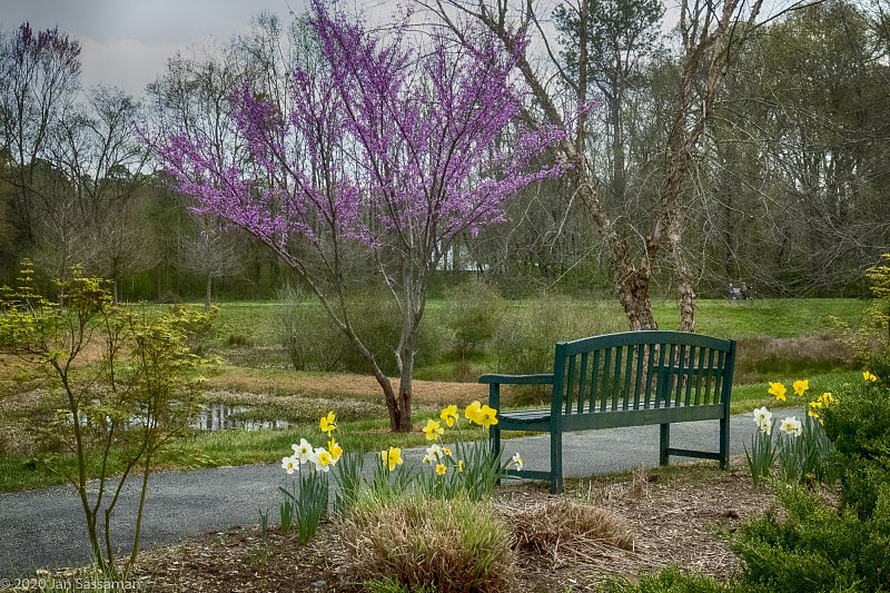 Galloway Ridge has a great detention pond basin surrounded by a paved walking trail and benches. Here is an early Spring view of the area around this basin with plants in bloom.