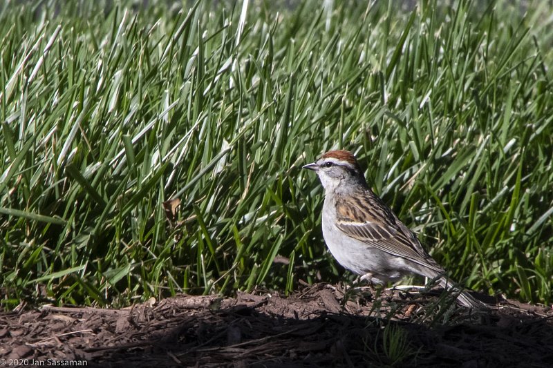 Chipping Sparrow (Spizella passerina)   Chipping Sparrows are year-round inhabitants here in Central North Carolina. They have one to three broods per year and like open tree-filled areas, like the areas between the detention ponds and the main Galloway building. According to the Cornell Lab, "In 1929, Edward Forbush called the Chipping Sparrow "the little brown-capped pensioner of the dooryard and lawn that comes about farmhouse doors to glean crumbs ken from the tablecloth by thrifty housewives." An interesting picture.
