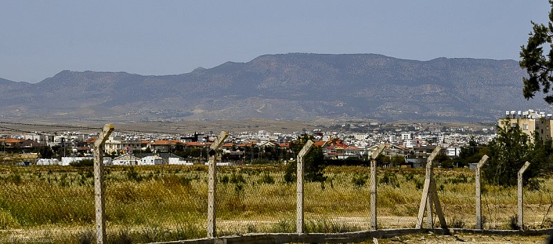 The highway passage from south to north, just west of Nicosia, passes through a fenced off UN-controlled buffer zone. The Pentadaktylos Mountains are in the background.