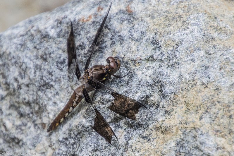 Juvenile male Common White Skimmer males develop a white powdery substance on the abdomen called pruinosity – this can be seen on other dragonflies, such as the blue substance on the Blue Dasher in these photos. The long abdomen is used to defend territory against intruding males. Females and juvenile males have a brown abdomen. However, the females can be differentiated from the males by the number of ark areas on the wings – two in males and three in females. Eggs are laid in the water and hatch into naiads in which stage they may spend years growing before they molt into winged adulthood and a land-based life. An interesting factoid - male dragonflies have extensive flight muscles used to fight off other males in order to be more successful in breeding and the majority of male Plathemis lydia body mass is accounted for by flight muscle. As a result, they have one of the highest flight-muscle mass/body weight) among animals.