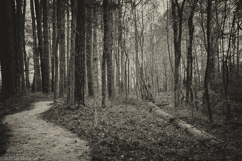A monochrome view of a portion of the woodland trail before the leaves come out.