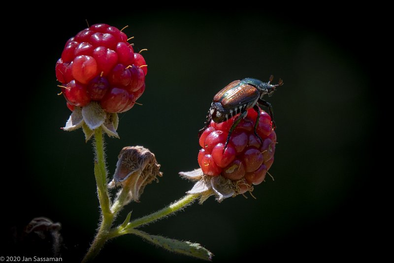 (Popillia japonica), the Japanese Beetle, is a species of scarab beetle. It is not very destructive in Japan, where it is controlled by natural predators, but in North America, it is a noted pest of about 300 species of plants including rose bushes, grapes, hops, canna, crape myrtles, birch trees, linden trees, and others.