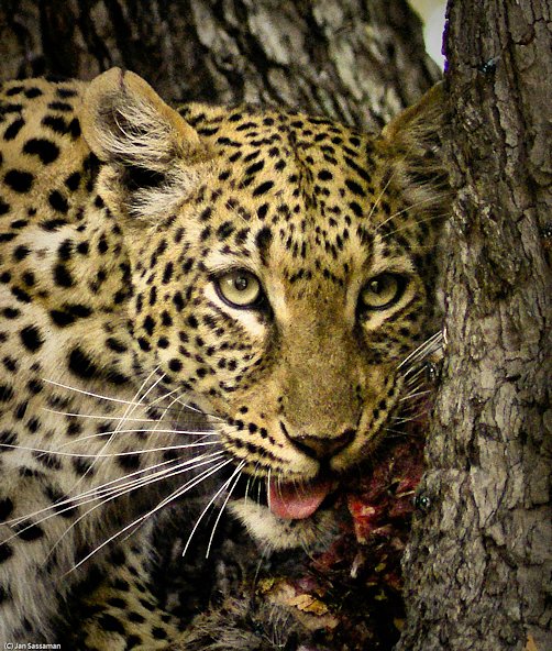 This was one of three leopards (a male, a female, and a juvenile) that we observed for some 30 minutes feeding on a wart hog cached in a jackalberry tree in the Linyati Concession, Botswana. October 2008
