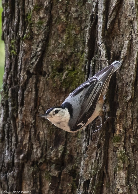This is probably the same guy I photographed in mid-May hanging around the bird feeder on the south side of Galloway property. It's Spanish name is "Trebador de pecho blanco", or "climber with a white breast." Nuthatches are noisy birds with a variety of calls serving a variety of functions.