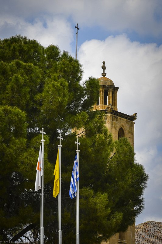 Again, banners representing the flags of Cyprus, Greece, and the Church, here at the entrance to a small church in the Nicosia suburb of Strovolos.